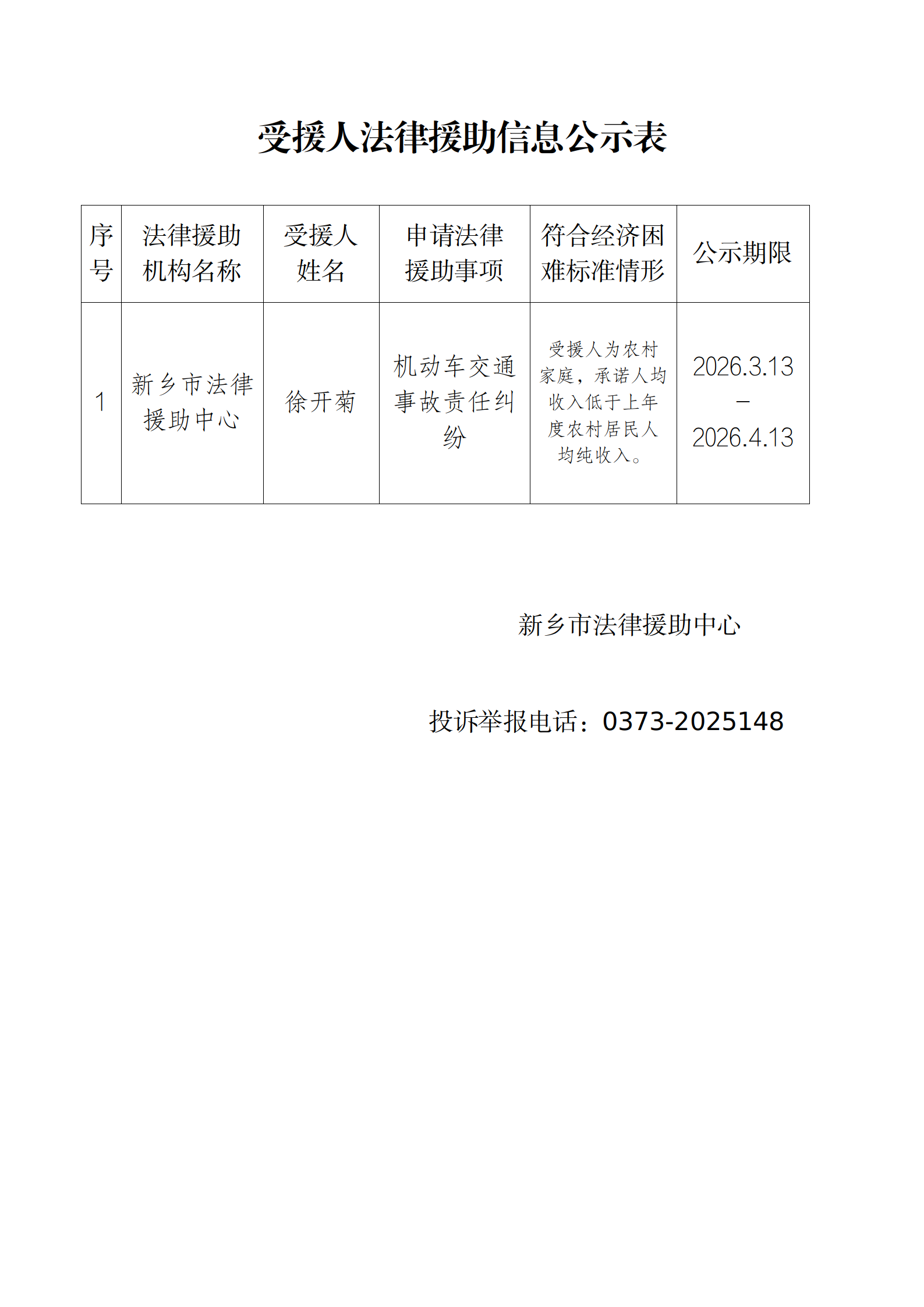 受援人法律援助信息公示20260313市中心