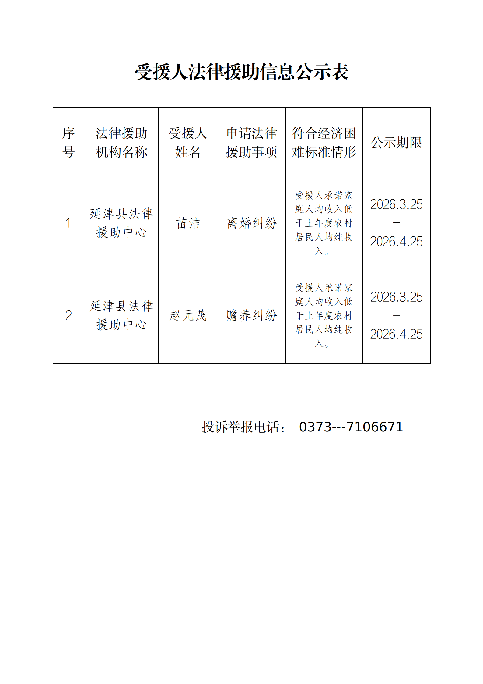 受援人法律援助信息公示20260325延津