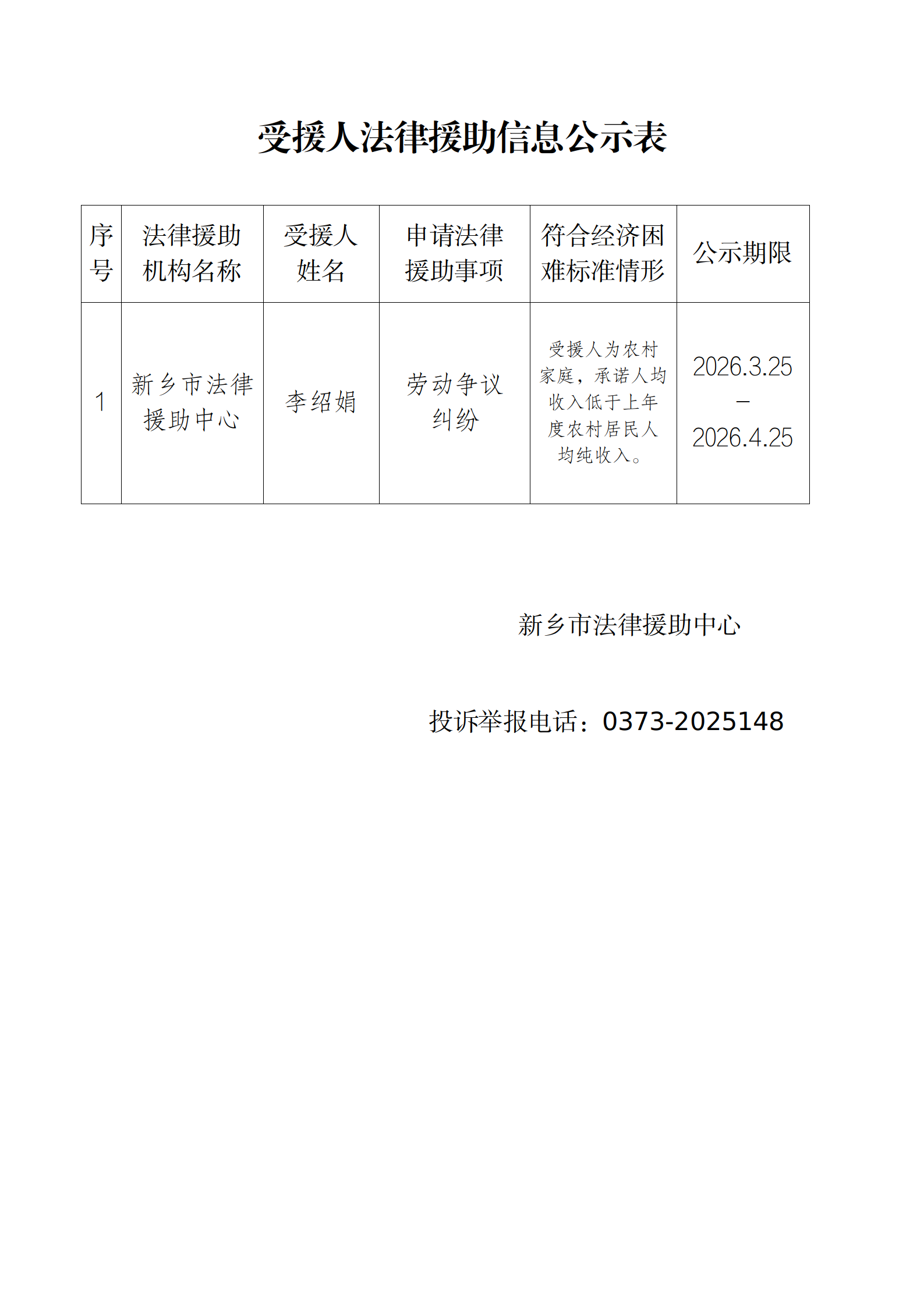 受援人法律援助信息公示20260325市中心